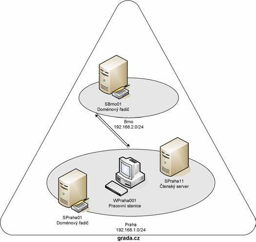 Jelikož samotná teorie fungování serveru Exchange 2003 by byla asi dost nudná, pojďme si dále vše prakticky ukazovat přímo na modelovém prostředí fiktivní firmy, jejíž jméno bude jak jinak než Grada (jedná se o čistě fiktivní firmu, která kromě jména nemá s firmou Grada Publishing nic společného). Doménová struktura (Forest) firmy se skládá z jedné domény, jejíž jméno je grada.cz a kterážto je zároveň názvem celé doménové struktury. Doména i doménová struktura jsou přepnuty na nejvyšší možnou funkční úroveň Windows Server 2003. Fyzická topologie firmy je tvořena dvěma pobočkami, a to v Praze a Brně. Pro tyto pobočky byly vytvořeny dvě sítě (Sites), pojmenované Praha a Brno, na něž jsou navázány IP podsítě 192.168.1.0/24 (Praha) a 192.168.2.0/24 (Brno). V každé síti (Site) je momentálně pouze jeden doménový řadič, a to SPraha01 v Praze a SBrno01 v Brně. Oba dva doménové řadiče jsou nainstalovány na operačním systému Windows Server 2003 a konfigurované jako globální katalogy a servery DNS. Pobočky jsou propojeny pomocí hardwarových směrovačů rychlostí 1 Mb/s, mezi kterými je natažena virtuální privátní síť. Mezi sítěmi je vytvořen objekt spojení sítí (Sitelink) PrahaBrno, na kterém jsou nastaveny replikace jednou za hodinu, a to od pondělí do neděle, 24 hodin nepřetržitě