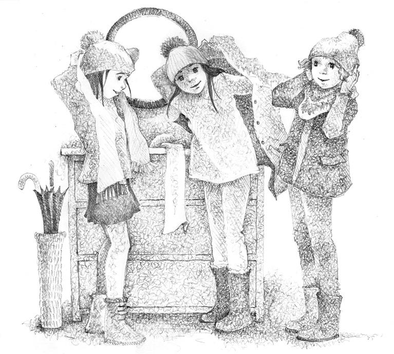 „Holčičky, já myslím, že neusne, dokud tady budete. Mohly byste mi prosím skočit ven pro cesmínu a břečťan? Viděla jsem je růst u řeky. Napadlo mě, že bychom jimi mohli svátečně vyzdobit kostel,