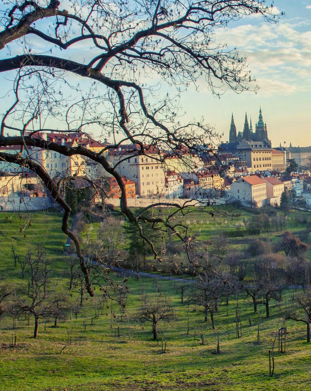 The best view of Prague is at dawn from Strahov. You see the entire Prague basin below you, with the silvery Vltava shining below you, with the silhouettes of the spires of the Old Town in the morning mists and above all of this the monumental castle with St. Vitus Cathedral, Wenceslas and Adalbert. The actual sunrise is announced ahead of time by the birds of Petřín, who are always ready ahead of time, in order to enjoy the view of the flaming ball, which appears on the horizon.