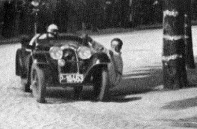 Zcela dramatický průjezd zatáčkou hradeckého okruhu v podání Otakara Nimshause za volantem a spolujezdcem Miloslavem Štípkem (1933)
