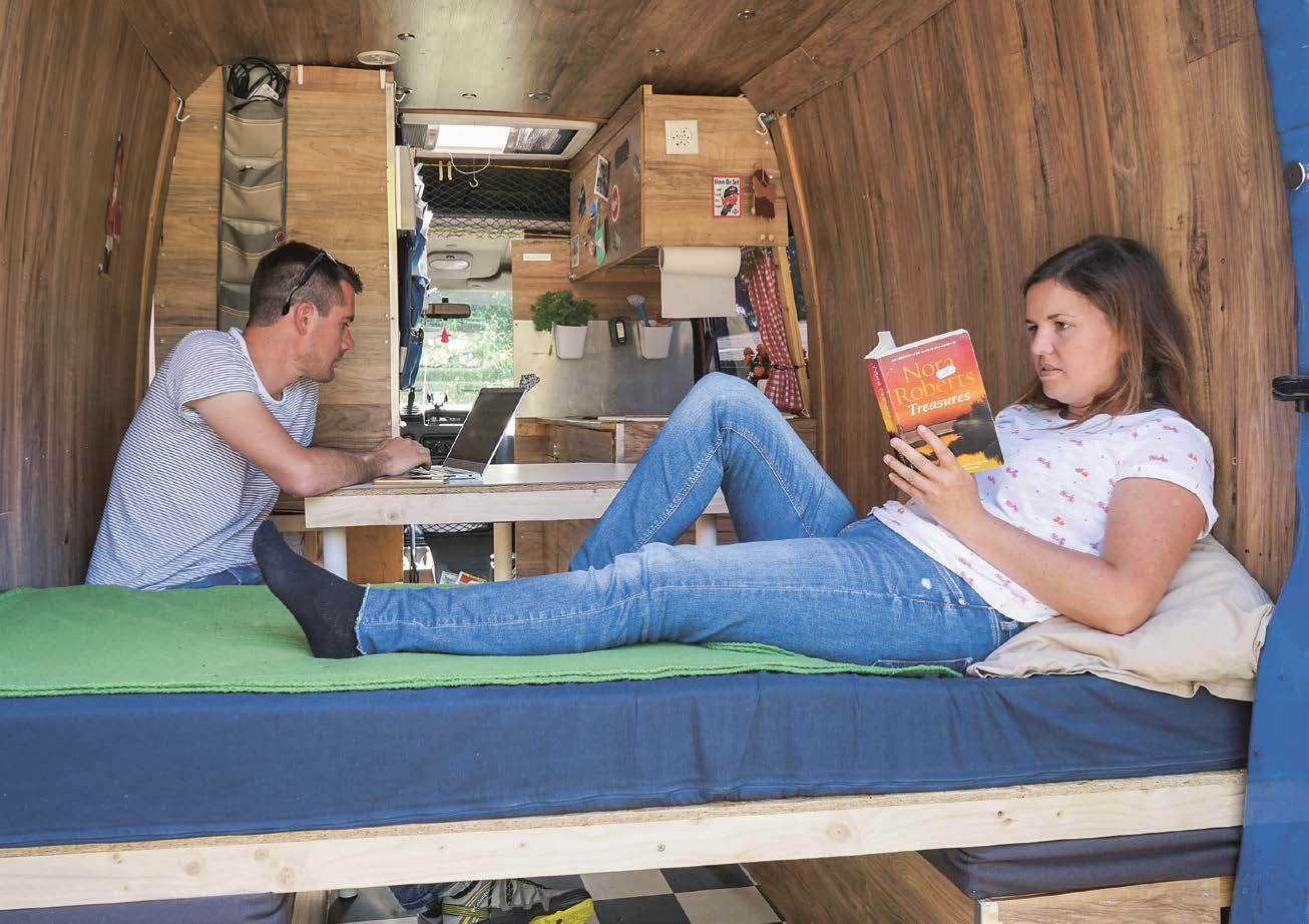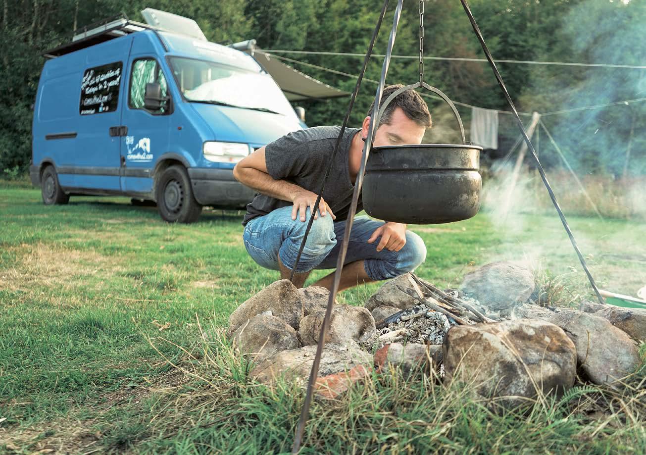 s tříplotýnkovým sporákem a velkým dřezem, kompresorovou lednici o obsah 90 litrů . Jedna půlka postele byla přestavitelná na stůl se dvěma židlemi . Další zařízení tvořila mobilní toaleta Porta Potti, sprcha s čerpadlem se dala používat jak uvnitř, tak venku . Střešní box poskytoval obrovské množství dalšího úložného prostoru, který jsme vyplnili například nafukovací kánoí, rybářským náčiním nebo stolním grilem . Protože ačkoli je náš karavan uvnitř celý obložen laminátem, měli jsme díky kratší verzi modelu dostatek manévrovacího prostoru, abychom nepřekročili povolenou hmotnost a mohli si dovolit vzít všechen ten luxus s sebou .