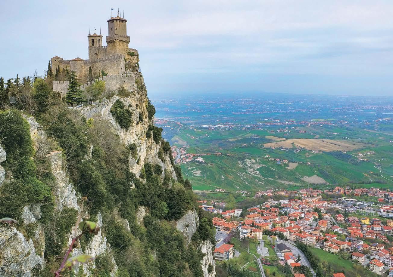 ležící na vrcholku hory Monte Titano . Zatímco brouzdáme uličkami mezi starými kamennými domy, uvědomujeme si, že je v něm neuvěřitelná spousta obchodů se zbraněmi . Krátký průzkum odhalí, že v minulosti se lidé v San Marinu dokázali několikrát velmi dobře ubránit, a proto jsou i dnes jeho obyvatelé na své zbraně pyšní . To je pravděpodobně také důvod, proč se tak malé město pyšní rovnou třemi opevněními . Vrcholu Monte Titana, který je na seznamu světového kulturního dědictví UNESCO, kralují tři pevnosti –Guaita, Cesta a Montale – a ty se vyplatí prozkoumat . Příkrá, ale nádherná cesta přírodním parkem vede nahoru na hřeben hory, odkud je výhled až k horskému pásmu Apenin na západě a Jaderskému moři na východě . Jednotlivé pevnosti spojuje dobře udržovaná cesta se spoustou odpočívadel, na kterých je možné posedět a načerpat nové síly . Jsme si jisti, že výhled by byl skutečně velkolepý, nám ale udělá pořádnou čáru přes rozpočet