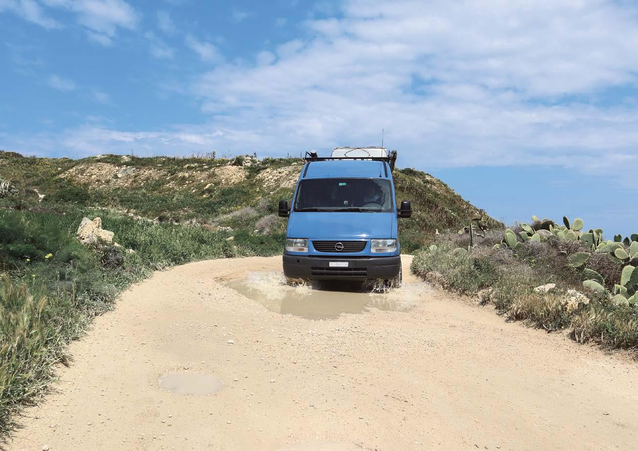 Dole: Také s pohonem na přední nápravu se dá projet loužemi a výmoly, jako tady na Maltě .