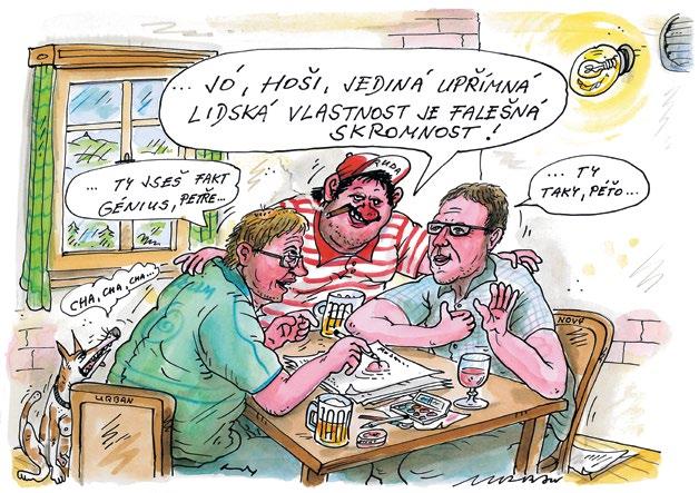 Vtom si k nim přisedl Ruda, chvilku je poslouchal a pak se rozesmál na celé kolo: „Vy s tím naděláte. Dejte mi chvilku, a já vám z těch mouder udělám pořádný vejšplechty, co lidem k něčemu vopravdu budou!“