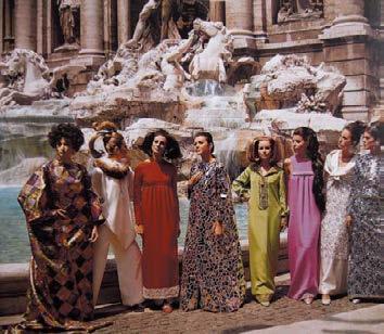 Italská móda se ve světě prosadila nejen díky stříbrnému plátnu, ale i modelkám fotografovaným na pozadí antických a renesančních památek. Fontana De Trevi s manekýnkami v maxi šatech a kombinézách zvaných „palazzo pyjama“, Řím, 1960.