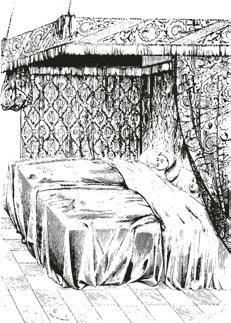 V ložnicích na hradech byly postele s nebesy,»1.07 ve kterých nebesa a závěsy vytvořily mikroklima. A do postele se dávala ohřívadla (láhve s teplou vodou). Taková postel s nebesy to byl intimní prostor sám pro sebe. A bylo možno se dočkat nečekaného překvapení, jako se to stalo panu Pickwickovi v zájezdním hostinci U vola ve Whitechapelu, kde strávil příjemný večer hovorem a popíjením brandy s vodou. Poté se odebral do svého pokoje (jak se domníval), svlékl se, zatáhl záclony postele a uložil se k spánku, načež zjistil, že do pokoje vstoupila dáma středních let s vlasy natočenými na žlutých papírcích a chystala se též ulehnout.»1.08