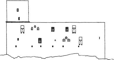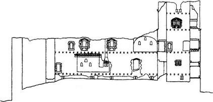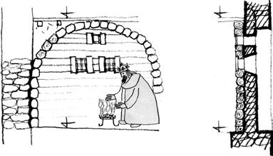 Spalo se v roubených komorách, které bylo možno snáze vytopit, když měl přijet pán hradu. Komory se stavěly současně se zděním a otisky jejich dřeva se zachovaly ve zdivu mnoha zřícenin, např. na Kašperku, Žebráku, Zlenicích, Andělské Hoře»TAB—C1.21 či Dobronicích.»TAB—C1.22 Komory byly někdy sroubeny do tvaru klenby. V čelní stěně mívaly dvě malá okénka a nad nimi ve vrcholu klenby okénko třetí, které bylo patrně určeno k odvětrání dýmu.4 Roubené komory totiž často neměly žádné otopné zařízení a vytápěly se pánvemi s řeřavým uhlím. Klenuté roubené komory se někdy projevily na vnější stěně hradu zaklenutou vpadlou nikou — zděná
