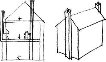 1.16 Umístění komínů, a v Itálii, b v Anglii, c u nás
