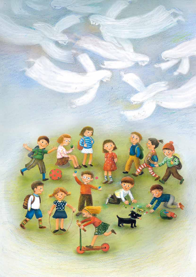 Děti jdou ze školy domů a jsou veselé na obloze kvůli tomu krouží andělé
