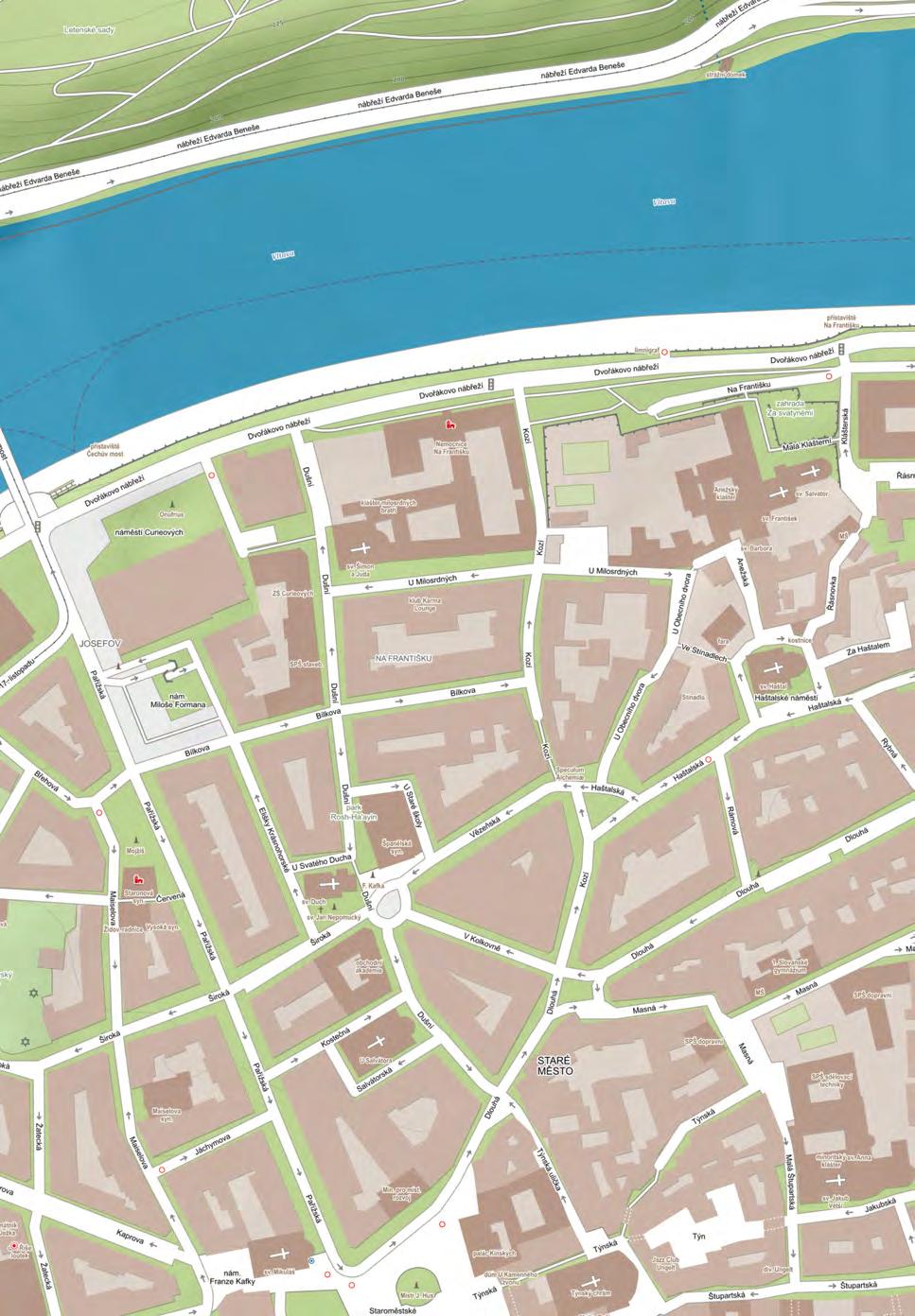 Anežská nebo Na Františku. Mezi Pařížskou a Dlouhou třídou se nachází oblast charakterizovaná výnosnými eklektickými činžáky, jež se objevily po asanaci z přelomu 19. a 20. století. Původní klikaté uličky byly nahrazeny ulicemi bez ducha a bez života jako jsou Bílkova, Dušní, Elišky Krásnohorské. Pak se vydáme směrem ke kostelu svatého Haštala a jsme opravdu překvapeni. Před námi se objevuje čtvrtička plná starobylých zákoutí, s podivně zakroucenými uličkami a průchody (02). Navíc je uprostřed velký klášter a mnoho turistů sem nezabloudí. Domky jsou většinou nízké a venkovského rázu, však se také nacházíme na bývalé periferii blízko nábřeží. Není divu, že tato čtvrť byla zřejmě jednou z hlavních inspirací Jaroslava Foglara pro jeho Stínadla (03, 04). Čtvrť Na Františku si vůbec oblíbilo mnoho spisovatelů. Géza Včelička tady prožil dětství a vzpomíná na tvrdý život zdejšího chudého, ale hrdého obyvatelstva a drsných klukovských part. Karel Hynek Mácha ve své povídce