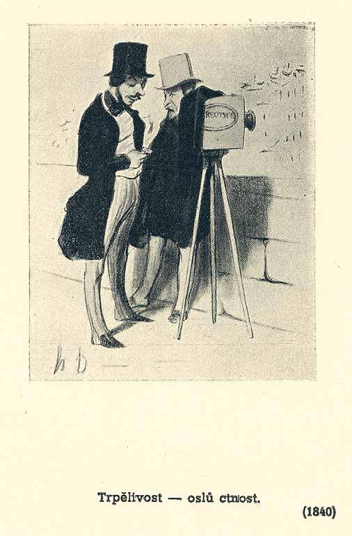 Karikatura Honoré Daumiera z roku 1840 ironizující dlouhý čas expozic daguerrotypií. Její faksimile Rudolf Skopec posílal v souboru Daumier vidí fotografii jako novoročenku 1943