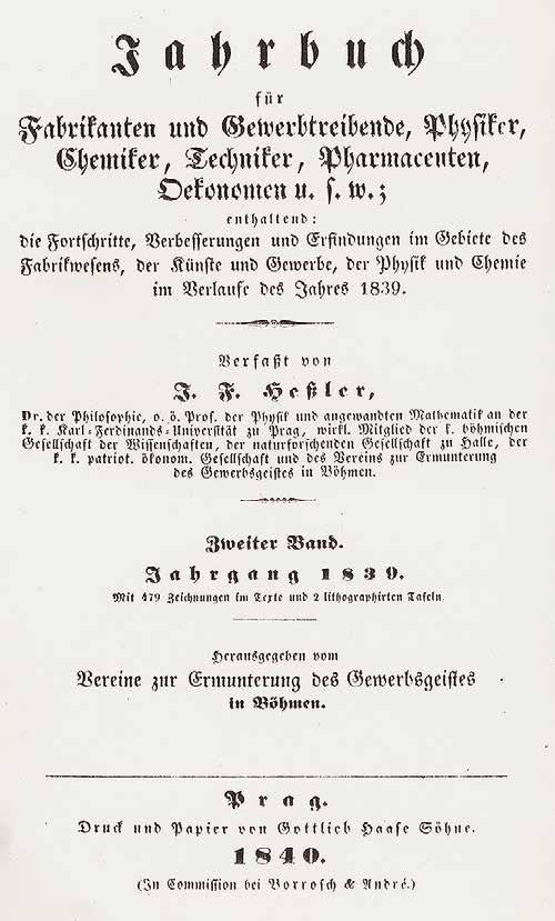 V Jahrbuch für Fabrikanten und Gewerbtreibende, Physiker, Chemiker, Techniker, Pharmacenten, Oekonomen u.s.w., na rok 1840 uspořádaném Ferdinandem Hesslerem a vydávaném v Praze (Vereine zur Ermunterung des Gewerbsgeistes in Böhmen) byla otištěna Hesslerova stať s názvem Daguerre’s Verfahren bei Fixirung der Bilder in der Camera obscura, která obsahuje i šest schematických náčrtků. Text je druhým podrobnějším popisem o zhotovování daguerrotypií otištěném v českých zemích.