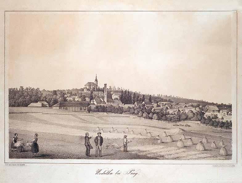 Litografie z tiskárny Braunsdorf v Drážďanech signovaná M. Golde s pohledem na Odolenou Vodu u Prahy provedená podle daguerrotypie neznámého autora