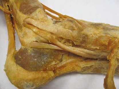process is a groove for the tendon of flexor hallucis longus tendon. Unlike other tendons on the medial side of the foot (the tibialis posterior, the flexor digitorum longus), the flexor hallucis longus rests on the medial wall of the calcaneus and in fracture-dislocations in this area and in the area of sustentaculum it gets interposed between the fragments. This is the cause of failure of reduction, requiring revision of the tendon and its release from the medial approach. Only then the fracture is reduced.