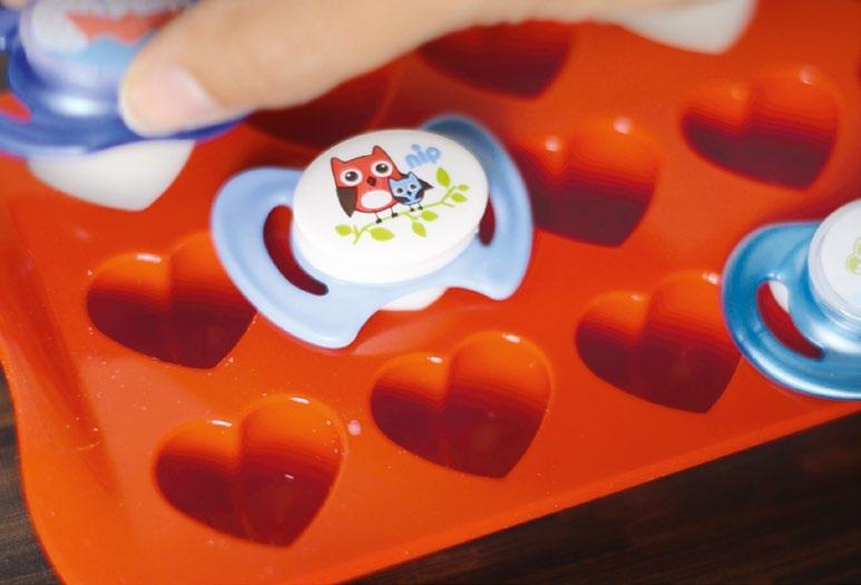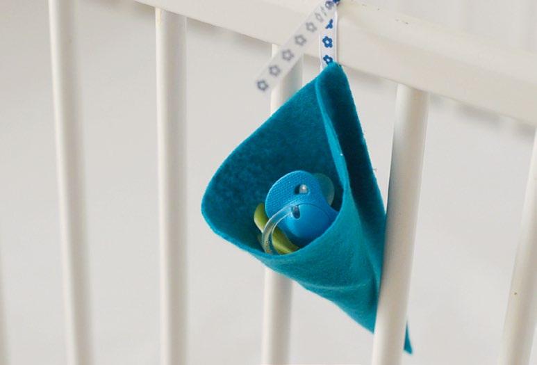 Na výrobu tohoto praktického „pomocníka“ se použije jen kousek filcu zastřiženého do čtverce, hezká stužka a tavná pistole. Filcový čtvereček složte na trojúhelník a odstřihněte vrchní roh. Pak filc zase rozložte, potřete jeho dvě strany horkým lepidlem a na každou z nich položte stužku a na horní straně ji nechte přečnívat. Jednu z bočních stran ještě jednou potřete lepidlem a hrany stlačte na sebe! Hotový sáček uvažte na postýlku a naplňte dudlíčky, které budou zejména v noci vždy při ruce.