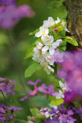 •>> Fantastická dvojice pro motýly: okrasná jabloň a měsíčnice roční (Lunaria annua).