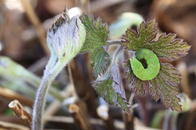 •>> Blýskavky mramorované nejsou vybíravé, na snímku si hoví jasně zelená housenka na výhonku sasanky hupejské.