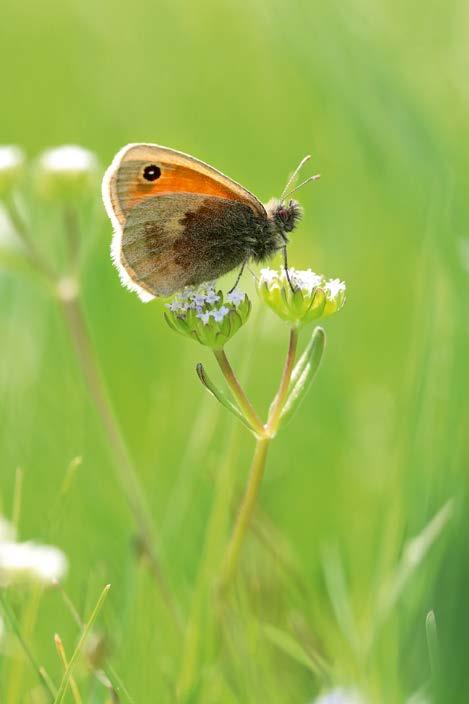 •>> Okáč poháňkový, tady na kozlíčku polním, potřebuje slunné louky, housenka se živí trávou.