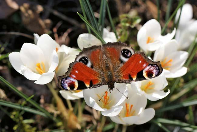 •>> Časní motýli potřebují časné květy: babočka paví oko na krokusu ‘Miss Vain’.