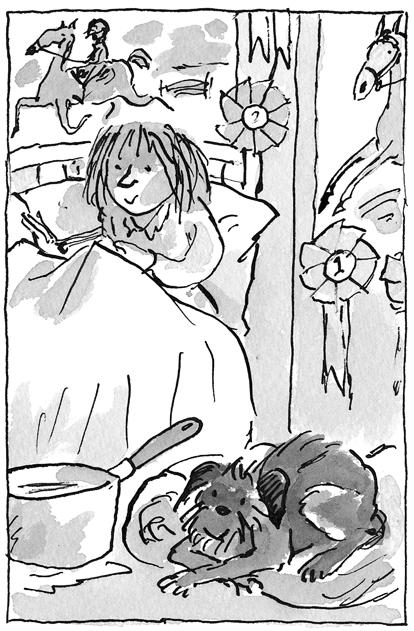 „To bylo, když táta pracoval v Newmarketu,“ odpověděl Sam a opatrně okrajoval připálené špičky klobásky. „Měli tam koně jménem Letící Blesk, a ten běhal tak strašně rychle, že museli při tréninkových cvalech nasadit dva koně, aby s ním udrželi tempo. Jeden ho vedl první půlku a druhý pak naskočil na posledních osm set metrů, protože s ním žádné zvíře nedokázalo udržet krok celou míli.“