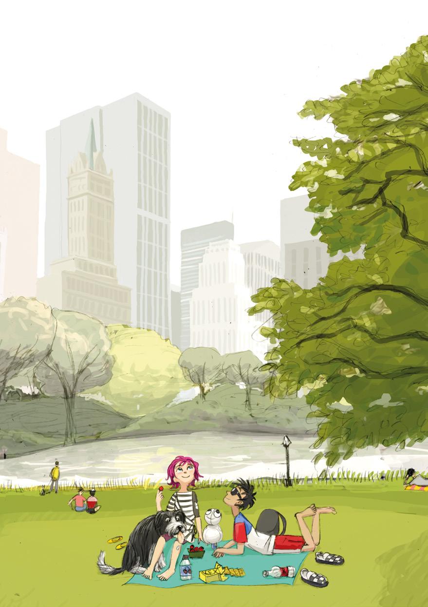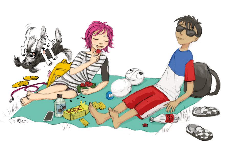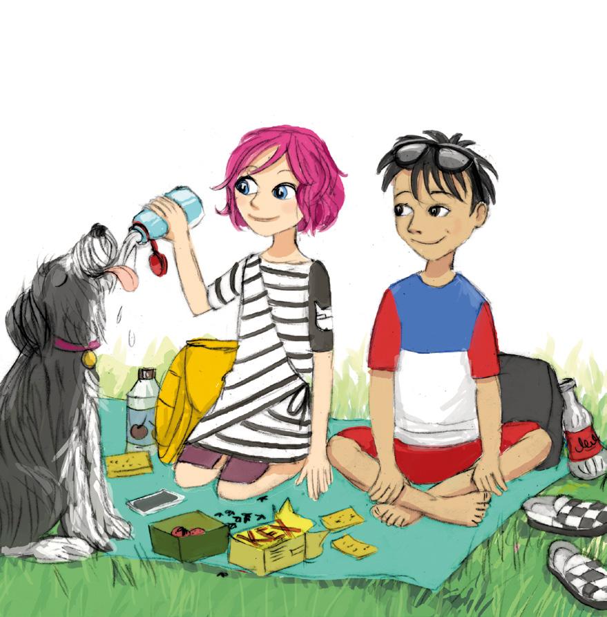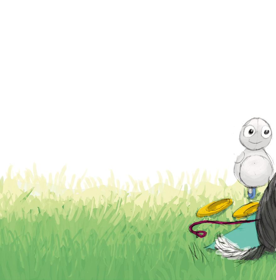 Také Ti-bot se rozvaloval na dece. Piknikové počasí se vydařilo. Nebe bylo blankytně modré, nefoukalo a ani sluníčko už tolik nepražilo. Mop skotačil s bílým štěňátkem ovčáckého psa.