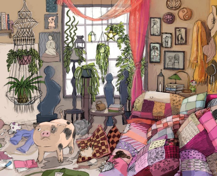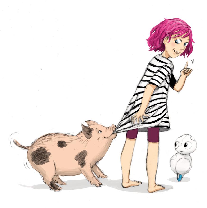 „Plavání bude muset počkat. Volala mi Dalia. Její prasátko Lotta pěkně vyvádí. Musíme tam hned zajít,“ prohlásila a začala balit věci do batohu.