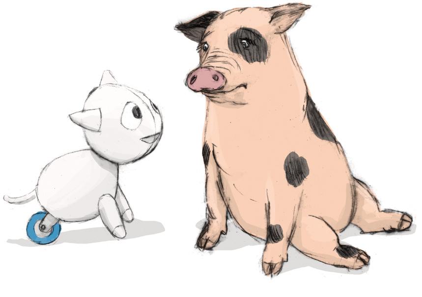 Zvědavý Ti-bot vtrhnul do obývacího pokoje jako první. Pachové senzory mu začaly pípat. Sotva ho prasátko uvidělo, zarylo do podlahy a vrhlo se k němu. Kopýtka jen klapala. Dalia popadla robota do náruče.