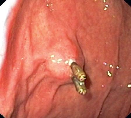 Hlavními důvody pro selhání rozlišení patologie při samotné endoskopii jsou selhání identifikace perforace a změněný nález pro probíhající hojící proces (ulcerace, časný karcinom, inkompletní endoskopické odstranění časných tumorů indikovaných k limitované resekci), v případě krvácení to může být nezvyklá lokalita krvácení, masivní krvácení s velkým množstvím koagul v žaludku a jícnu (obr. 2.4) a malé intermitentně krvácející léze, například Dieulafoyův vřed. Předoperační endoskopie nabízí různé možnosti značení lézí včetně značení tuší (obr. 2.5) [1], značení autologní krví [2], klipem, který zvláště u key-hole biopsie slouží i jako uzávěr defektu (obr. 2.6) [3–5], počítačovými metodami [6] či na základě předoperační endoskopické evaluace [7]. Vzhledem ke složitému cévnímu zásobení žaludku a jícnu s nejistým šířením barvy a také nejasným hranicím tumorů navzdory identifikaci značky však nedoznalo předoperační značení ve srovnání s tlustým střevem podobného rozšíření.
