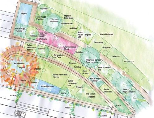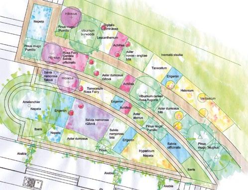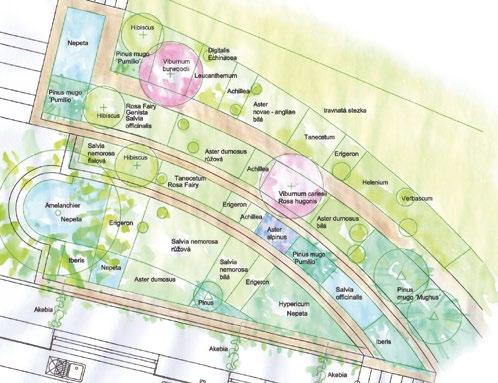 s Návrh osazovacího plánu a předpokládané barevné působení rostlin na jaře, v létě a na podzim.
