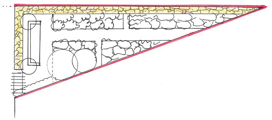 pohledy od sousedů. Z otevřené jižní strany poskytnou pohledovou clonu pro odpočinkový kout pnoucí rostliny a keře, přičemž zůstane dostatek slunečního světla a tepla i pro bylinky (a zeď bude sálat získané teplo ještě dlouho po setmění). Vznikne tak klidné místo k posezení, kde se budou za teplého počasí kumulovat omamující bylinkové vůně. Ostrou špici trojúhelníku lze navíc otupit keřem či jinou vhodnou rostlinou, nebo také zajímavou dekorací. Focal point dlouhý prostor opticky zkrátí –místo ozvláštní např. drobný vodní prvek jako pítko pro ptáky nebo malý pramínek. Oddělením ostrého úhlu získá hlavní plocha pozemku přirozenější tvar a její následné rozplánování už nebude náročné.