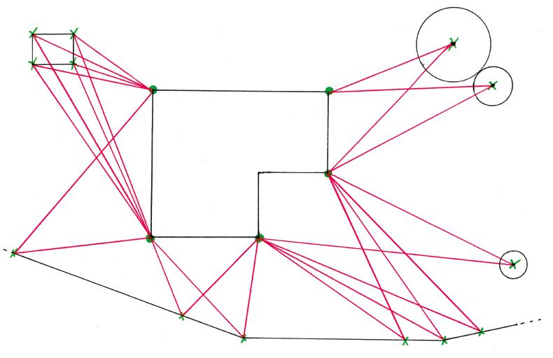 s Triangulace nabízí osvědčený způsob, jak změřit vzdálenost za pomoci trojúhelníků. Nejprve se zaměří dům i s okny a dveřmi. Na domu se určí vždy dva body –může to být roh domu, okraj okna nebo dveří, ze kterých se postupně zaměří a zakreslí důležité prvky na pozemku (např. pergola a dřeviny) a také hranice parcely. Pokud je pozemek nepravidelný příliš, je dobré postupovat při celé jeho hranici přibližně po metru.
