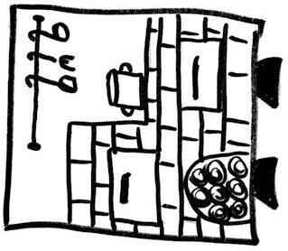 plyšové hračky, koš na hračky, kyblík s barvou a štětce, hrnec a vařečka, koš s prádlem, vystřižené trojúhelníky s nakreslenými kroužky, které představují sýry, košík pro kozu, pilník pro kováře, deky či kusy látky na přikrytí