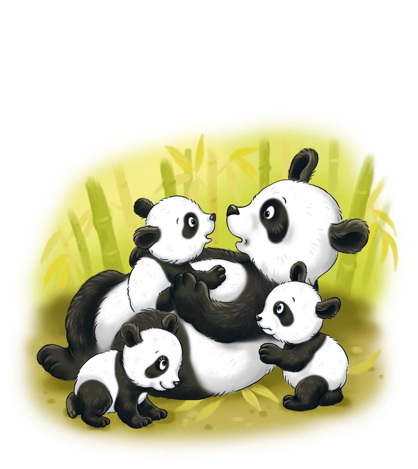 Támhle se zrovna batolí pandí máma se třemi medvíďaty. Jsou to dvě slečny a jeden mladík. Pandí slečny se drží blízko mámy, ale panda Fanda stále někam odbíhá a něco prozkoumává.