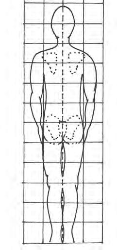 osa páteře je totožná sosou těla; osa boků je rovnoběžná sosou ramen aje kolmá na osu těla; ramena jsou stejně vysoko asymetricky rozložená; lopatky jsou celou plochou přitisknutykhrudníku ajsou symetricky oddáleny od páteře; thorako-abdominální trojúhelníky (prostor mezi paží atělem) jsou symetrické; středy kyčelních, kolenních ahlezenních kloubů jsou na svislici (klenba nohy je fyziologická, není příčně ani podélně plochá).