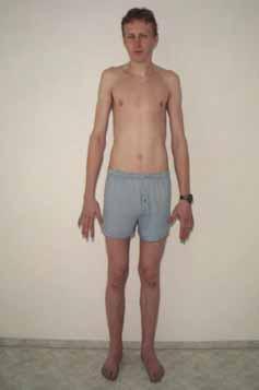 Klinický obraz Postihuje především svalově kosterní, kardiovaskulární a oční systém. Pacienti mají vysokou postavu s dlouhýma tenkýma nohama, s dlouhými štíhlými prsty (arachnodaktylie), hypermobilními klouby a deformitami hrudníku (obr. 1.7 a 1.8). Čtvrtina nemocných má rozsáhlé strie, elastosis perforans serpiginosa a deficit podkožního tuku. Charakteristickým očním nálezem je bilaterální subluxace známá jako ectopia lentis.