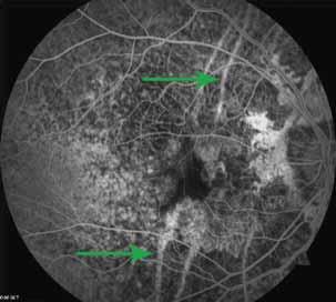 Typický je nález patologických prasklin Bruchovy membrány (angl. angioid streaks) na očním pozadí patrný již záhy po vzniku kožních změn až u 85 % postižených (obr. 1.10) a časté krvácení do sítnice s postupně hrozícím oslepnutím. Kardiovaskulární projevy vznikají následkem degenerace a kalcifikace elastických vláken ve stěně artérií, vedou k akcelerované ateroskleróze, koronární a mozkové ischemii, renovaskulární hypertenzi. Postižení se může projevit již ve velmi časném dětství jako klaudikace či angina pectoris a způsobit i náhlé úmrtí. Dalšími komplikacemi je časté krvácení z trávicího a močového traktu.