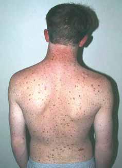 Klinický obraz Lentiginóza (lentiginosis) jsou mnohočetné nepravidelné tmavě hnědé makuly různé velikosti, nejvíce na obličeji, krku a hrudníku, které se objevují již záhy po narození a přibývají s věkem nezávisle na sluneční expozici (obr. 1.4 a 1.5). Současně se mohou najít kávové nebo hypopigmentované skvrny, pihy v podpaží, hyperelasticita a onychodystrofie. U nemocných častěji vzniká melanom.