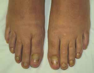 Je charakterizován triádou: žluté nehty, lymfedém a pleurální výpotek. Nehty na rukou a nohou jsou světle žluté až zelené, ztluštělé, rostou nápadně pomalu, nemusejí mít lunulu ani kutikulu (obr. 1.3). Často vzniká paronychium. U 80 % pacientů se zjistí lymfedém, nejvíce nohou, ale i obličeje a hrudníku. Z plicních potíží bývají časté bronchitidy, bronchiektazie, chronické sinusitidy a pleuritidy. Lymfedém a plicní potíže se mohou projevit později, a proto by se pacienti s touto dystrofií nehtů měli sledovat. Syndrom se pozoruje také u nemocí štítné žlázy, při nefrotickém syndromu a maligních nádorech vnitřních orgánů.