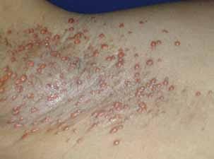 papuly lineárně uspořádané či shlukující se do ložisek připomínající kůži oškubaného kuřete patrné nejvíce po stranách krku, ale také v podpaží, v podkolenních