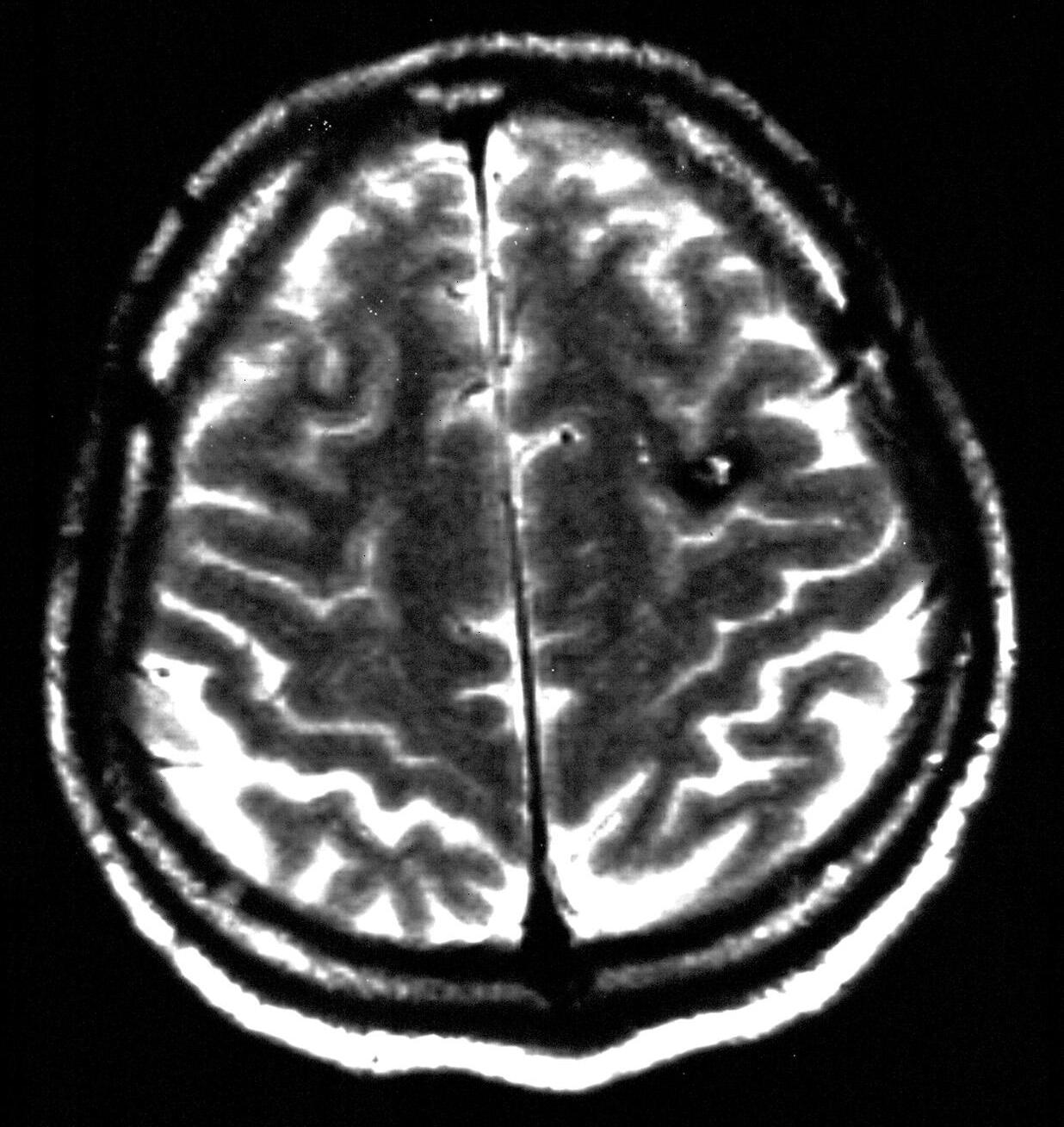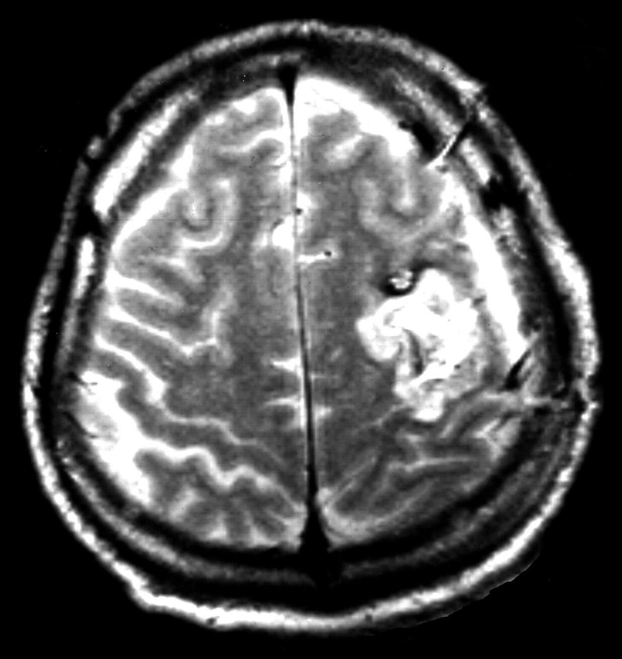 A: PředoperačníMRI:Frontálněvlevojuxtakortikálněložisko10×7mm. B: Operacebeznavigaceabezurčenízvratu fází.Připrvníoperacibylaprovedenapředsulcuscentralis,předv.precentralis,sulkotomieagyrotomie.Vhloubce3cm bylanalezenaširokážíla,jinakbylnáleznepřesvědčivý.Pooperacihemiparézavpravoaafázie.MRI:posteriorněodznáméhokavernomujsouprokrvácenépooperačnízměny.Podalšíoperacičástečnáapotřetíoperaciúplnáexstirpacekavernomu.Intracerebrálníhematom7×5cmfrontálněvlevo.Hemiplegievpravoaafázie.Dokladynejsouzpracovišťautorů.