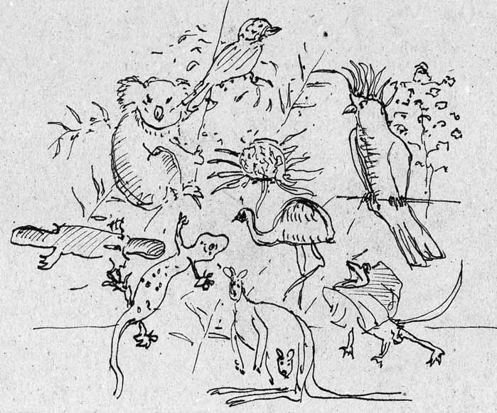 Vydejme se tedy na cestu, než náš vyměřený čas jak rychlý bumerang prostorem prosviští a spadne pod blahovičník do trávy. Naše klikaté putování zachytíme na kreslených barevných pohlednicích jako šumné pozdravy. Ale teď už je čas, abychom nejprve přistáli u břehů tajuplné jižní země, zvané Terra Australis!
