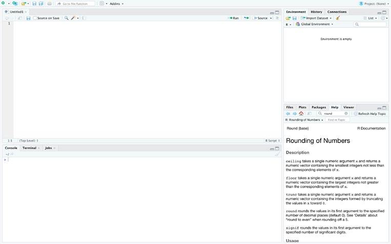 n.r-project.org, kde je potřeba vybrat zemi. Po kliknutí na odkaz uvedený pro Českou republiku zvolíme svůj operační systém a poté stáhneme instalační soubor (pro MS Windows ho najdeme pod odkazem "base", u macOS je potřeba kliknout na odkaz odpovídající verzi macOS na našem počítači). Dále postupujeme dle pokynů průvodce instalací. Po dokončení instalace by už bylo možné R začít používat, přesto pro pohodlnější a přehlednější práci doporučujeme instalovat ještě RStudio. RStudio lze stáhnout na stránce www.rstudio.com [9]. Na horní liště této stránky se nachází odkaz "Download,", který přesměruje na stránku s nabízenými licencemi. Pro běžné používání stačí zvolit bezplatnou licenci RStudio Desktop. Dále se postupuje dle pokynů průvodce instalací. Po dokončení obou instalací stačí otevřít RStudio, které se automaticky propojí s už staženým R. Obrázek 1.1 poskytuje náhled prázdného prostředí RStudia.