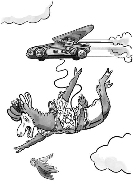 Otevřel se panel na střeše auta a dopředu se natáhl kovový pařát, který držel cívku drátěného provazu. Filip si zavázal provaz kolem pasu, druhý konec upevnil do svěráku na autě a vyskočil.