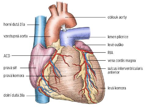 směrem k srdečnímu hrotu, který někdy přechází a dostává se až na zadní stěnu. Poměrně často (asi v 1/3) se ve svém průběhu na několik milimetrů zanořuje do svaloviny (intramyokardiální průběh), aby se opět vrátil do subepikardiálního tuku. Nad tepnou tak vznikají tzv. myokardiální svalové můstky. Tepna vydává ramus diagonalis (RD) a intramyokardiálně probíhající perforující větve (rr. interventriculares septales – RS) do septa komor. Obvykle první a nejsilnější septální větev rozděluje RIA na proximální a distální úsek; RIA zásobuje krví největší část myokardu levé srdeční komory – její přední stěnu a přední 2/3 mezikomorové přepážky. Ramus circumflexus se po odstupu z kmene levé koronární tepny stáčí doleva a dozadu a probíhá v sulcus atrioventricularis, pod levým ouškem. Jeho délka je různá – někdy dosahuje jen na margo obtusus, většinou však přechází na zadní stěnu a vzácněji dosahuje až k sulcus interventricularis posterior (tzv. levotyp); v tomto případě je celá levá komora srdeční vyživována z ACS. Ramus circumflexus vydává ramus marginalis sinister (RMS) a asi v 50 % větev pro atrioventrikulární uzel. Dále RC vyživuje boční stěnu levé komory a spolu s pravou věnčitou tepnou i její zadní stěnu. Z ACS je zásobován anterolaterální papilární sval mitrální chlopně. Schéma