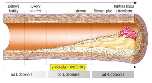 Obr. 5.6 Schéma vzniku ateromového plátu od endoteliální dysfunkce k ruptuře plátu a uzávěru tepny