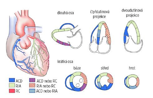 Obr. 5.5 Zásobení a povodí jednotlivých koronárních tepen z echokardiografického pohledu