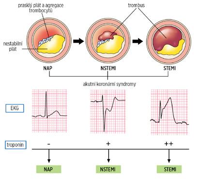 s rupturou dochází k dynamické tvorbě bílého destičkového trombu s různým stupněm omezení koronárního průtoku. Jeho další osud určuje klinickou manifestaci. Neokluzivní destičkový trombus je obvykle podkladem AKS bez elevací ST s ischemií subendokardiálních vrstev myokardu, proto v EKG nacházíme většinou deprese úseku ST. Působením trombinu vzniká z fibrinogenu fibrinová síť, která zachytává červené krvinky, a důsledkem je červený, již okludující trombus. Uzávěr koronární tepny vede k ischemii subendokardiálních i subepikardiálních vrstev, a proto jsou v EKG elevace úseku ST. Konečný klinický obraz je výsledkem poměrně složitého děje, kde hrají roli stupeň organického zúžení tepny ateromatózním plátem, stupeň dynamické intraluminální trombózy s průvodní vazokonstrikcí, délka trvání okluze a přítomnost kolaterální cirkulace. Zkušenosti z koronarografických vyšetření ukazují, že tvorba trombu a jeho rozpouštění jsou dynamické procesy s podílem spontánní fibrinolýzy. Proto jsou projevy tak pestré, od zcela nespecifických až k typickým obrazům, jako je nestabilní angina pectoris a infarkt myokardu. Popsaný patofyziologický mechanismus je důvodem podání kombinace protidestičkových a antikoagulačních léků nemocným s AKS co nejdříve v rámci přednemocničního ošetření s nadějí na eliminaci úplného uzávěru koronární tepny.