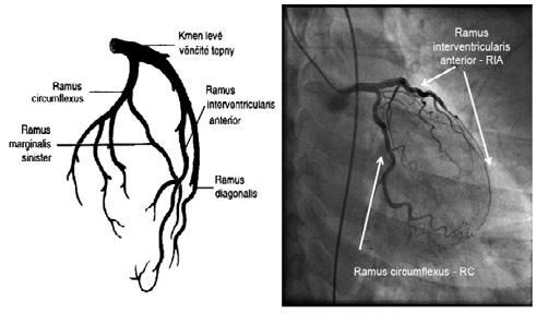 Obr. 5.3 Levá koronární tepna (ACS) – schéma (vlevo) a obraz při SKG – pravá šikmá projekce (vpravo)