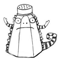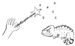 „Nech ho být!“ vykřikla jsem. Vtom se jako kouzlem (no, nejspíš kouzlem) objevil na kuchyňské polici tetin hrůzu nahánějící chameleon Mizík. Z Mizíka mi naskakuje husí kůže. Nikdy totiž nevím, jakou bude mít barvu nebo kde se zrovna objeví. V jednom kuse mě špehuje a donáší na mě tetě Divizně. Právě teď byl zamaskovaný za sklenicí žabího potěru.