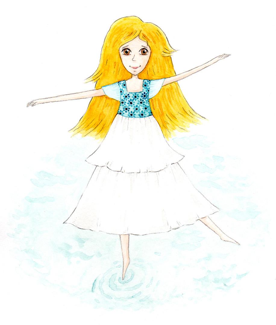 „Ještě počkej! Musím ti představit vílu Vltavěnku.“ Nabral trochu vody do dlaní, zatočil se a vychrstnul ji do vzduchu. Voda se rázem proměnila v tisíce drobných kapiček, které dopadly zpátky na hladinu. A najednou tam stála malá slečna s velkými hnědými kukadly, hlubšími než studánky u samotného pramene. Tancovala po špičkách na vodní hladině, až jí dlouhá bílá sukně okolo nohou vlála. Mile se usmívala a navíc voněla jako rozkvetlá jarní louka. Vltavínek byl okouzlený. Víla byla krásnější než sen, a tak není divu, že úžasem oněměl. Pozoroval, jak lehce tančí, a nedokázal ze sebe vypravit ani slovo.